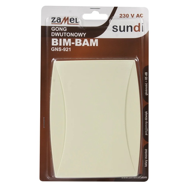 Дверной звонок Zamel Бим-Бам — проводной электромеханический звонок для установки в квартире, доме, офисе или на объекте с постоянным питанием от сети 220В. Модель выполнена в классическом белом цвете и воспроизводит характерный двойной сигнал «Бим-Бам», который хорошо различим в бытовых условиях благодаря громкости до 85 дБ.