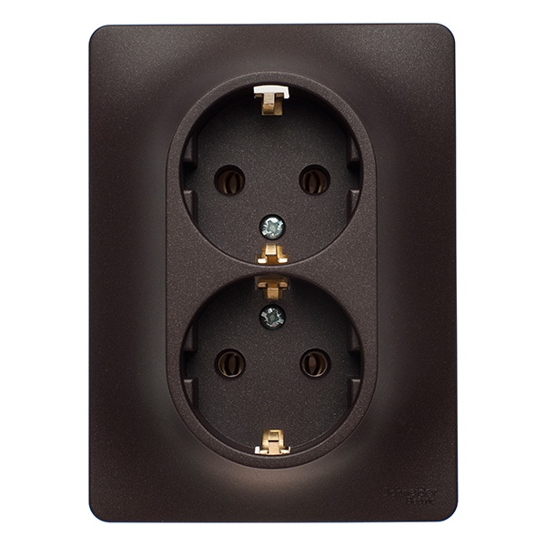 Розетка двойная SE Glossa (в сборе, цвет шоколад) с заземлением, без шторок подходит для сетей 250 В, на ток 16 А.- Заземляющий контакт обеспечивает дополнительную защиту от удара электрическим током. При наличии заземления электрический потенциал уходит в землю, защищая человека.- Выполнен из материала PС+ASA, стойкого к УФ-излучению и появлению царапин.- Двойная розетка позволяет подключить два устройства в одном месте.