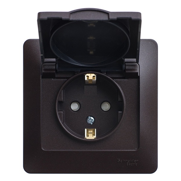 Розетка SE Glossa (в сборе, цвет шоколад) одинарная с заземлением, шторками и крышкой подходит для сетей 250 В, на ток 16 А.- Заземляющий контакт обеспечивает дополнительную защиту от удара электрическим током. При наличии заземления электрический потенциал уходит в землю, защищая человека.- Выполнен из материала PС+ASA, стойкого к УФ-излучению и появлению царапин.- Эргономичные клеммы розеток расположены в один ряд.