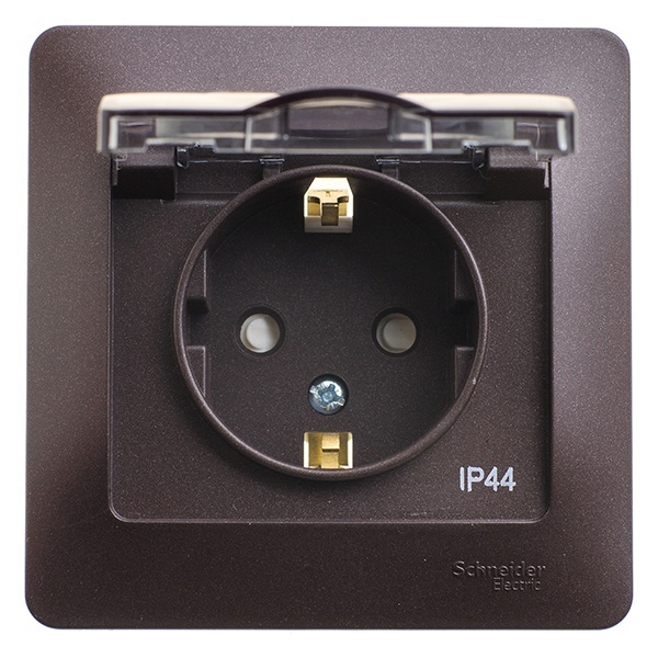 Розетка SE Glossa (в сборе, цвет шоколад) одинарная с заземлением, шторками и крышкой подходит для сетей 250 В, на ток 16 А.- Изделие со степенью защиты IP44 обеспечит безопасность использования в ванной и на кухне.- Заземляющий контакт обеспечивает дополнительную защиту от удара электрическим током. При наличии заземления электрический потенциал уходит в землю, защищая человека.- Выполнен из материала PС+ASA, стойкого к УФ-излучению и появлению царапин.