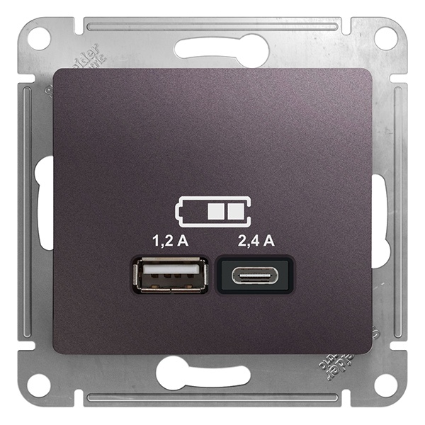 Розетка SE Glossa (цвет сиреневый туман) двойная USB с разъемами типа A+C.- Выполнена из материала PС+ASA, стойкого к УФ-излучению и появлению царапин.- Самая современная USB-зарядка с двумя разъемами позволяет заряжать как стандартные мобильные устройства через разъем типа А, так и новейшие устройства, в том числе ноутбуки, с разъемом типа С.