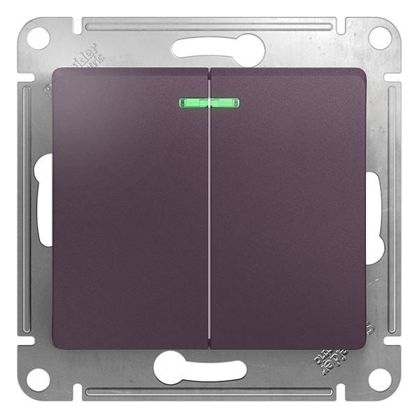 Механизм SE Glossa (цвет сиреневый туман) выключателя 2-клавишного с подсветкой подходит для сетей 250 В, на ток 10 А.- Благодаря современной светодиодной подсветке зеленого цвета изделие легко найти в темноте.- Двухклавишный выключатель позволяет управлять двумя источниками света с одной точки.- Выполнен из материала PС+ASA, стойкого к УФ-излучению и появлению царапин.- Эргономичные клеммы расположены в два ряда: сверху и снизу.