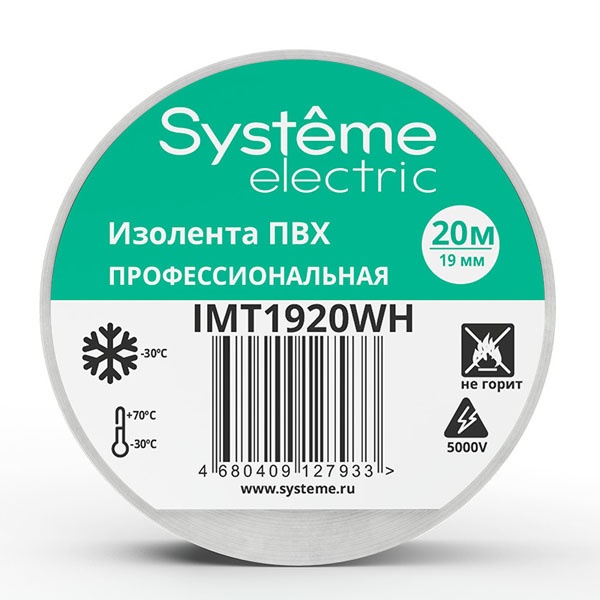 Изоляционная лента ПВХ 20м ширина 19мм белая Систем Электрик IMT1920WH