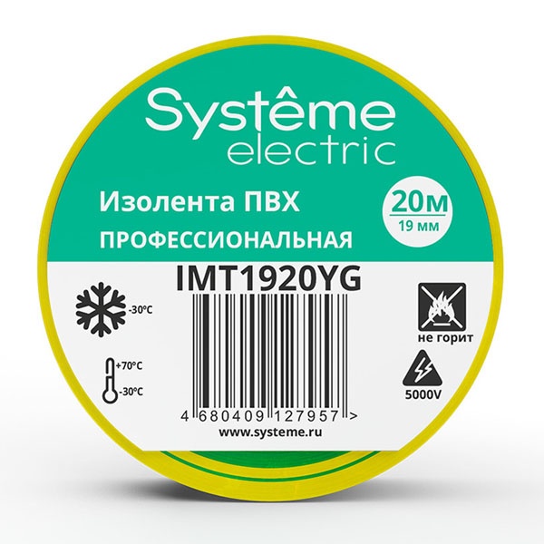 Изоляционная лента ПВХ 20м ширина 19мм желто-зеленая Систем Электрик IMT1920YG