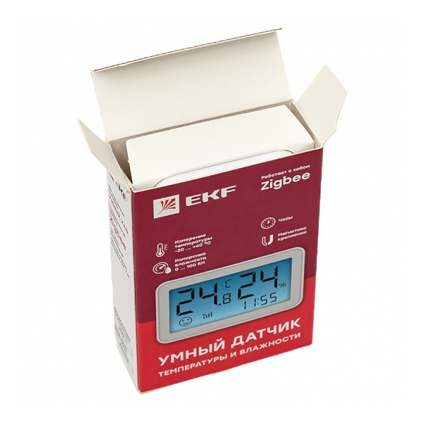 Умный датчик измерения влажности и температуры воздуха от компании ЭКФ предназначен для измерения температуры и относительной влажности воздуха, отображения и беспроводной передачи результатов измерения. Устройство работает по протоколу Zigbee передаёт данные через хаб в установленное на смартфоне приложение, что позволяет контролировать состояние датчика в любое время и в любом месте. Управление датчиком производится с любого гаджета на базе операционной системы Android 4.4/IOS 8.0 или выше через приложение EKF Connect.