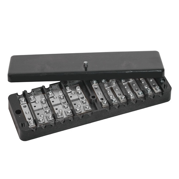 Это компактное устройство, которое представляет собой прямоугольный футляр, выполненный из толстостенного ударопрочного и негорючего материала. В нем размещается группа клеммных контактов, образующих зажимную клеть. По краям основания расположены сквозные отверстия, предназначенные для крепления испытательной коробки к несущей поверхности. Бокс обладает следующими параметрами: 68х220х33 мм. Масса – 400 г. Материалом изготовления контактной группы является сталь. Данная модель коробки со стальными контактами имеет непрозрачную крышку черного цвета, на которой расположены специальные ушки для установки пломбы или отверстие под винт.