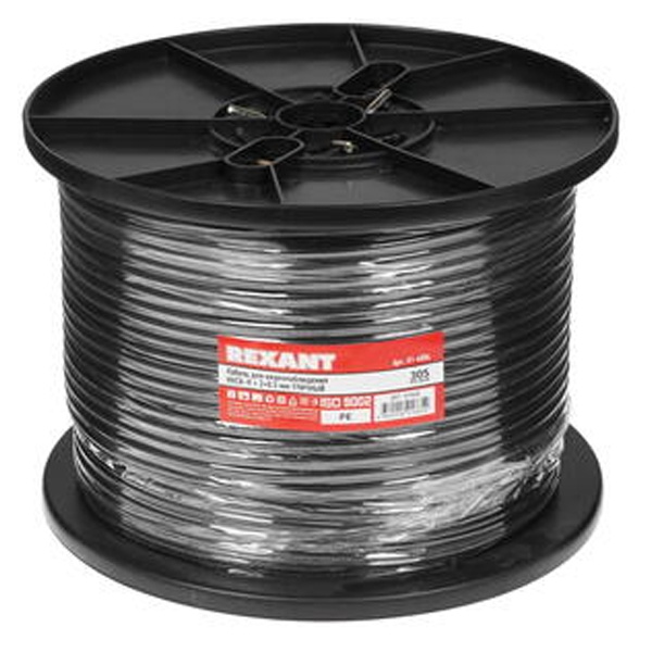 Кабель ККСВ-П+2х0.5 мм REXANT предназначен для передачи телевизионных сигналов в системах видеонаблюдения с одновременным подключением питания и/или передачи сигналов управления.Кабель ККСВ-П+2х0.5 мм состоит из радиочастотного (коаксиального) кабеля и двух жил питания. Коаксиальный кабель 3с-2v состоит из медного монолитного проводника, вспененного диэлектрика, внешнего проводника из алюминиевых жил в виде оплётки и оболочки из полиэтилена(PE). Жилы питания (медные) монолитные в изоляции из ПВХ и оболочке из полиэтилена(PE). Коаксиальный кабель и жилы питания соединены между собой. Кабель имеет форму восьмерки.Использование кабеля ККСВ-П+2х0.5 мм REXANT регламентирует сертификат соответствия Таможенного Союза (EAC).