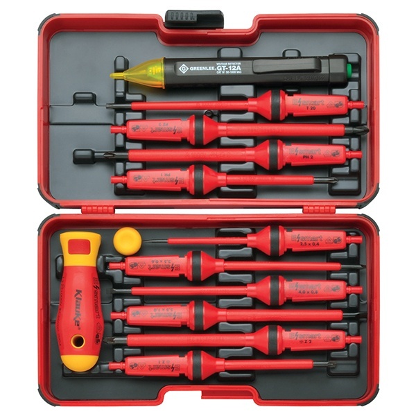 Набор из 12 сменных отверточных вставок в соответствии с IEC (МЭК) для всех применений, включая бесконтактный индикатор напряжения GT-12, в пластиковом боксе.