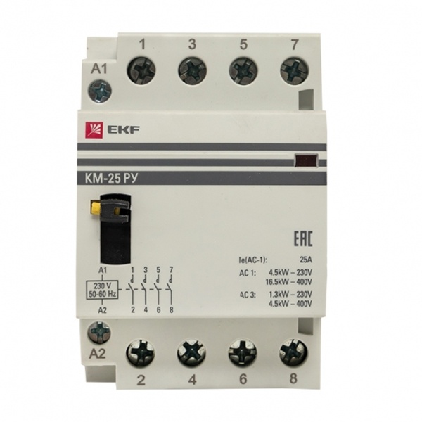 Трехмодульный контактор ЕКФ 25А с 4мя разомкнутыми контактами, ручным управлением и катушкой на 220 Вольт km-3m-25-40