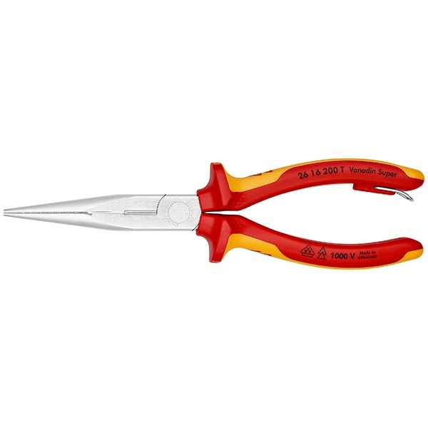 Длинногубцы с режущими кромками VDE, полукруглые прямые губки, рез: проволока средней твёрдости d 3.2 мм, твёрдая проволока d 2.2 мм, 200 мм, диэлектрические, хром, 2К ручки, страховочное крепление