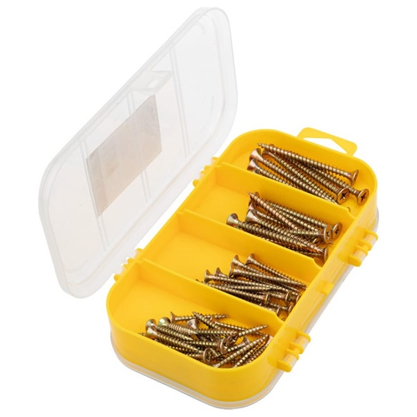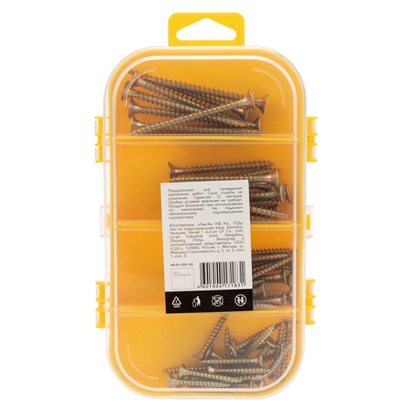 Набор саморезов для ДСП от компании "KRANZ" является хорошим выбором для любых крепежных работ. Саморезы выполнены из лучших за свою цену материалов. Лучше всего подходят для использования по дереву. В наборе имеются саморезы для ДСП и их разновидности.1. Саморезы для ДСП:- 3,0x12 - 52 шт.- 3,5х19 - 40 шт.- 3,5x30 - 30 шт.- 4,0x30 - 20 шт.- 4,0x40 - 15 шт.- 5,0x50 - 10 шт.- 5,0x60 - 8 шт.Саморезы для ДСП отлично подходят для крепления дверных петель, соединения двух деревянных полотен, да и вообще всего что связанно с деревом. Будь то сборка шкафа, тумбочки или деревянного стола, именно такие саморезы помогут вам надежно и качественно скрепить деревянное изделие. Конечно же их можно использовать как на картоне, так и на фанере, ведь они тоже являются деревянной продукцией.Саморезы для ДСП уже давно заняли свое место в мебельной индустрии. Для сборки абсолютно любой мебели, где есть деревянная конструкция, обязательно будет использован саморез для ДСП, именно благодаря им мебель может служить по несколько десятков лет.2. Пластиковый органайзерПластиковая коробочка для хранения саморезов и других крепежных изделий. Имеет размерыШирина280 ммВысота45 ммГлубина190 мм