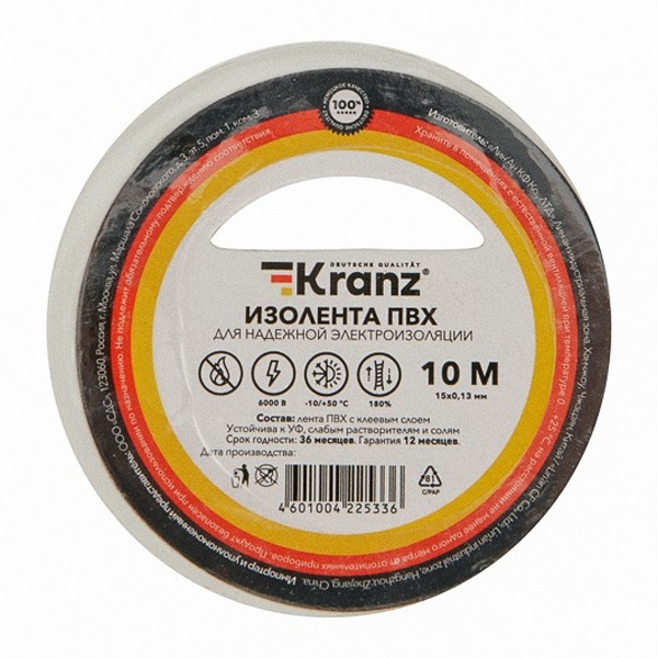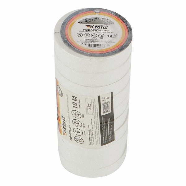 Изолента белая Kranz представляет собой поливинилхлоридную пленку, разрезанную на полосы шириной 15 мм и длиной 10 м. На одну ее сторону нанесено клеевое покрытие, которое и играет ключевую роль в предназначении этого расходного материала. Значительной особенностью изоляционной ленты является ее термостойкость – она не поддерживает горение. Диапазон температур использования изолент довольно широк - от -10°С до +50°С.