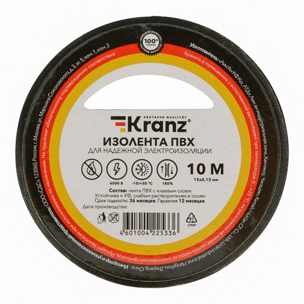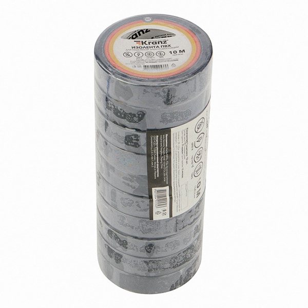 Изолента Kranz 15мм х 10м черная эластична, плохо рвется, устойчива к погодным явлениям, обладает высокими диэлектрическими свойствами и хорошей адгезией (скрепляет поверхности). Главными свойствами этого материла является способность герметизировать, защищать от влаги, слабых растворителей и солей.