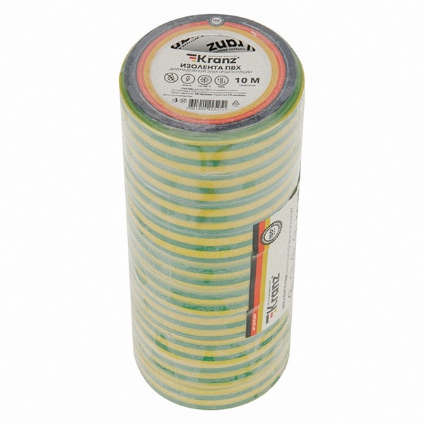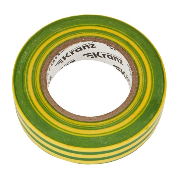 Изолента Kranz 15мм х 10м желто-зеленая эластична, плохо рвется, устойчива к погодным явлениям, обладает высокими диэлектрическими свойствами и хорошей адгезией (скрепляет поверхности). Главными свойствами этого материла является способность герметизировать, защищать от влаги, слабых растворителей и солей.