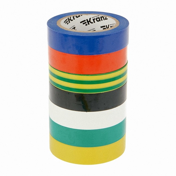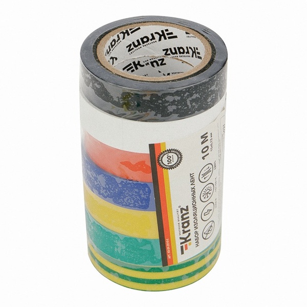 Изоляционная лента от производителя Kranz представлена набором из 7 цветов и предназначена для электрической изоляции, надежного соединения, защиты от внешних факторов и герметизации кабелей, проводов и шнуров. Благодаря наличию различных цветов в комплекте она также служит для цветной маркировки. Изолента обеспечивает высокое качество обмотки и защищает места соединения от влаги, пыли, грязи, механических повреждений и перепадов температуры окружающей среды. Материалом ее изготовления выступает высококачественный поливинилхлорид с клеевым слоем. Один рулон изоленты имеет длину 10 метров с шириной – 15 мм и толщиной – 0,13 мм. В комплект входят материалы в следующих цветах: черный, синий, белый, красный, зеленый, желтый и желто-зеленый. Среди их достоинств выделяют: выдержку напряжения до 6000 Вольт и растяжения до 180% и эксплуатацию при температуре от -10 до +50 градусов Цельсия. Изоляционная лента не поддерживает горение, устойчива к УФ-излучению, а также слабым растворителям и солям. Находит широкое применение не только у профессионалов, но и в быту.