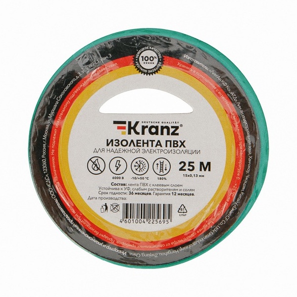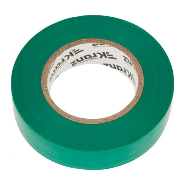 Изолента Kranz 15мм х 25м зеленая эластична, плохо рвется, устойчива к погодным явлениям, обладает высокими диэлектрическими свойствами и хорошей адгезией (скрепляет поверхности). Главными свойствами этого материла является способность герметизировать, защищать от влаги, слабых растворителей и солей.