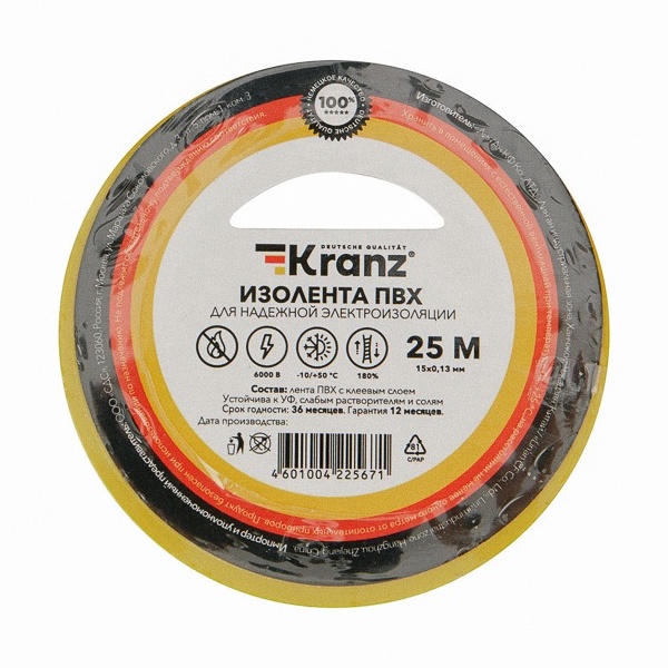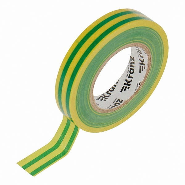 Изолента Kranz 15мм х 25м желто-зеленая эластична, плохо рвется, устойчива к погодным явлениям, обладает высокими диэлектрическими свойствами и хорошей адгезией (скрепляет поверхности). Главными свойствами этого материла является способность герметизировать, защищать от влаги, слабых растворителей и солей.