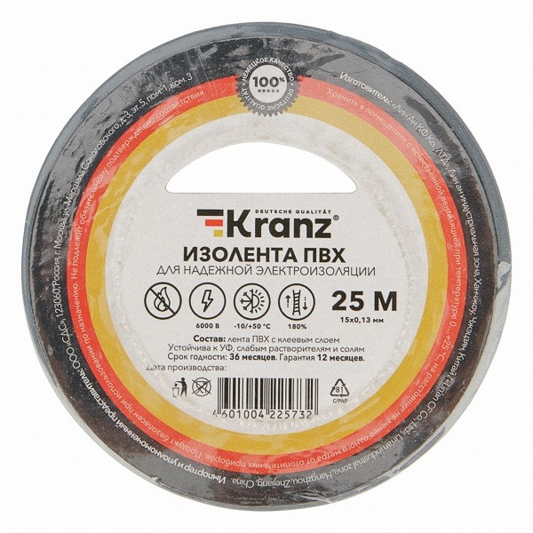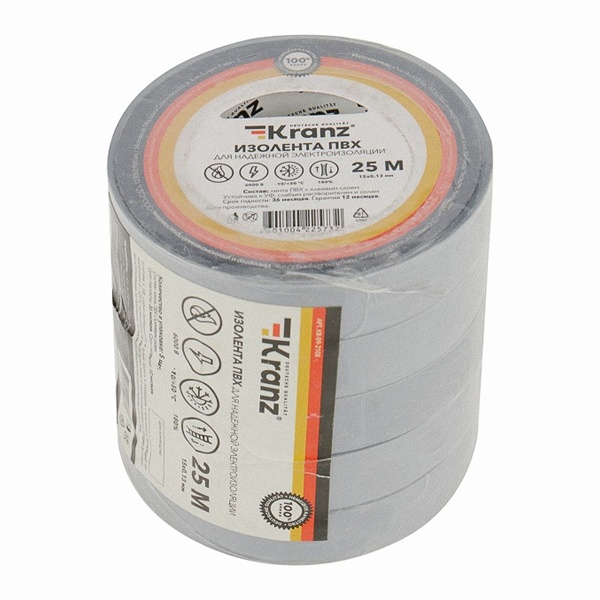 Изолента Kranz 15мм х 25м серая эластична, плохо рвется, устойчива к погодным явлениям, обладает высокими диэлектрическими свойствами и хорошей адгезией (скрепляет поверхности). Главными свойствами этого материла является способность герметизировать, защищать от влаги, слабых растворителей и солей.