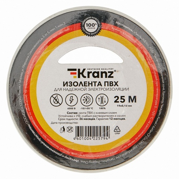 Изолента Kranz 19мм х 25м белая эластична, плохо рвется, устойчива к погодным явлениям, обладает высокими диэлектрическими свойствами и хорошей адгезией (скрепляет поверхности). Главными свойствами этого материла является способность герметизировать, защищать от влаги, слабых растворителей и солей.