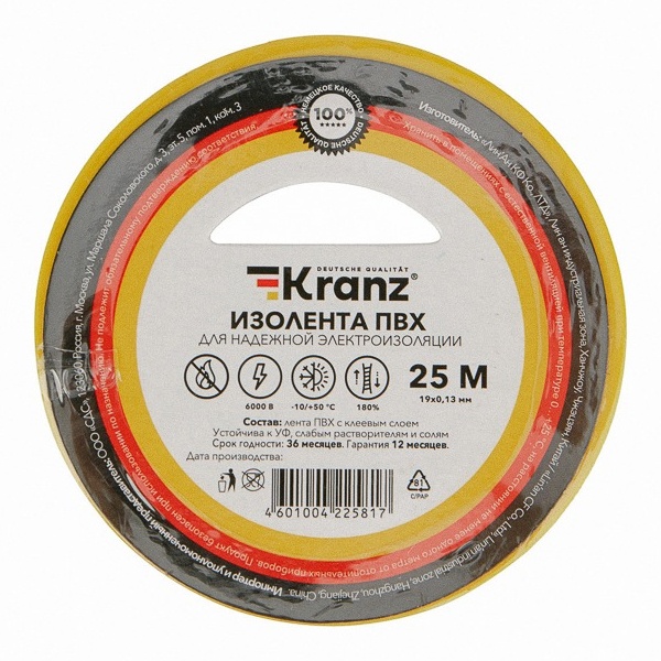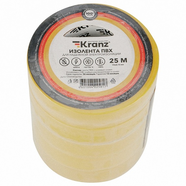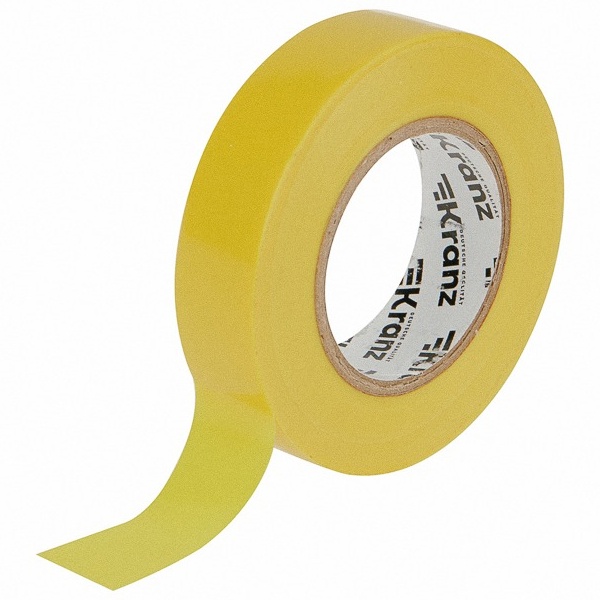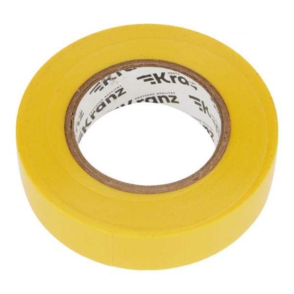 Изолента Kranz 19мм х 25м желтая эластична, плохо рвется, устойчива к погодным явлениям, обладает высокими диэлектрическими свойствами и хорошей адгезией (скрепляет поверхности). Главными свойствами этого материла является способность герметизировать, защищать от влаги, слабых растворителей и солей.