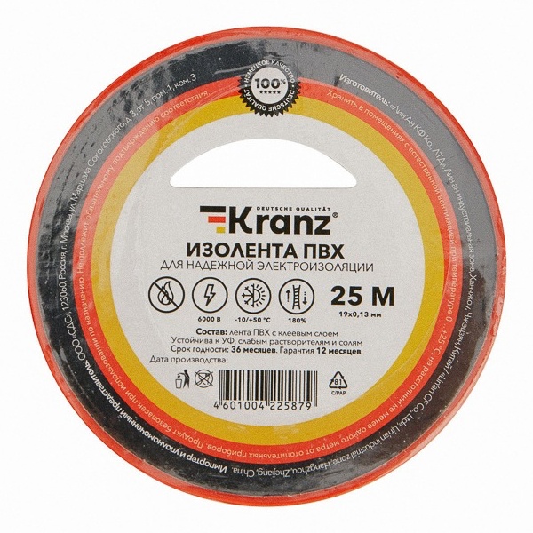 Изолента Kranz 19мм х 25м красная эластична, плохо рвется, устойчива к погодным явлениям, обладает высокими диэлектрическими свойствами и хорошей адгезией (скрепляет поверхности). Главными свойствами этого материла является способность герметизировать, защищать от влаги, слабых растворителей и солей.
