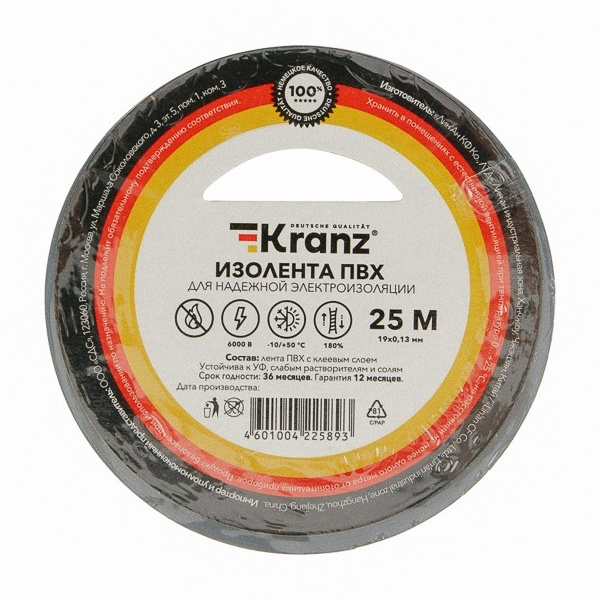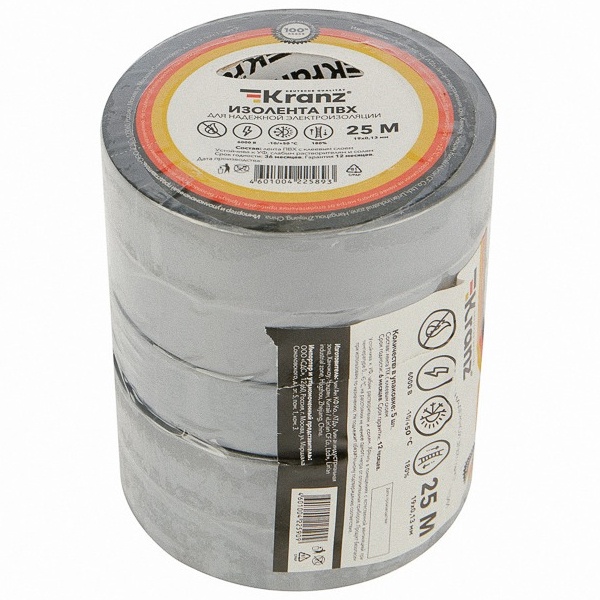 Изолента Kranz 19мм х 25м серая эластична, плохо рвется, устойчива к погодным явлениям, обладает высокими диэлектрическими свойствами и хорошей адгезией (скрепляет поверхности). Главными свойствами этого материла является способность герметизировать, защищать от влаги, слабых растворителей и солей.