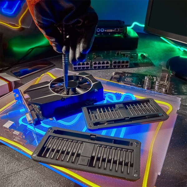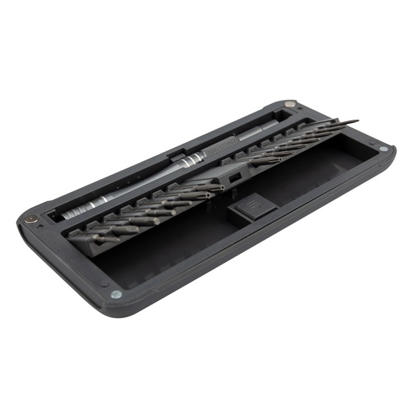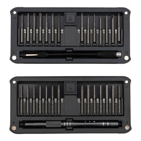В наборе отвертка с 29 битами: 1.5, 2.0, 3.0, 4.0 PH0, PH1, PH2, PH00, PH000, T1, T2, T3, T4, T5, TR6, TR8, TR10, TR15, H1.5, H2.0, H3.0, P2, P5, P6, U2.6, Y0.7, Y3, Triangle 2.3, Special PH2.5.