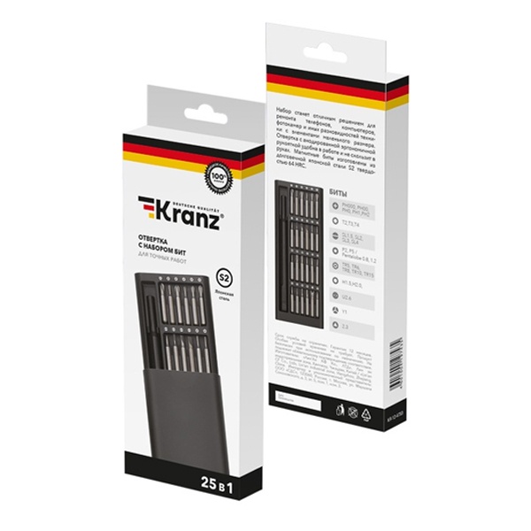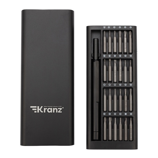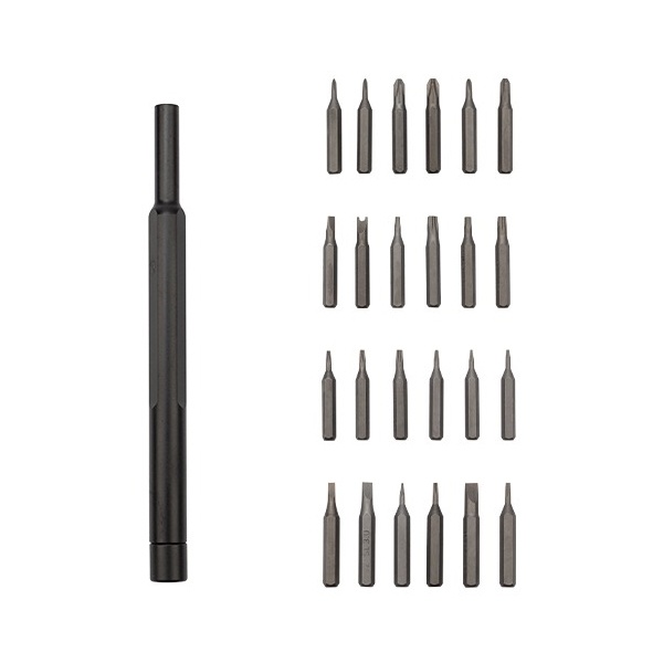 Набор отверток для точных работ полностью сделан из алюминия и имеет 24 магнитные насадки. Анодированная ручка отвертки не скользит в руках и оснащена колпачком для хранения мелкого крепежа. 24 различные, точно подобранные по характеристикам магнитные насадки, пригодятся как для профессионального ремонта, так и в быту. Разъемы подходят для починки телефонов, компьютеров, приемников и для многих популярных приборов, которые используются в быту. Твердость составляет 60 HRC.