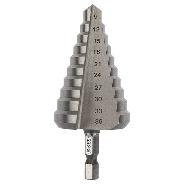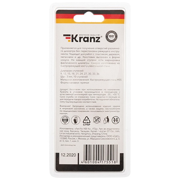 Ступенчатое сверло торговой марки Kranz изготовлено из высококачественной легированной быстрорежущей стали и может использоваться для сверления отверстий диаметром от 9 до 36 мм, без смены оснастки. Оно предназначено для следующих материалов: листовая сталь толщиной до 4-6 мм, тонкостенные цветные металлы, чугун, гипсокартон, пластмассы. Конусное ступенчатое сверло имеет специфическую структуру в виде поступательных ступеней, где каждая последующая ступень отличается большим диаметром, это позволяет постоянно изменять диаметр отверстия, не останавливая работу. Это сверло универсально и подходит для проведения нескольких операций одновременно: сверление, снятие фаски, шлифование. На каждой ступени сверла есть маркировка фактического диаметра, количество ступеней – 10, шаг ступеней – 3 мм. Диапазон ступеней – 9, 12, 15, 18, 21, 24, 27, 30, 33, 36 мм. Ступенчатое сверло имеет цилиндрический хвостовик. Форма канавки – прямая. Сверло обладает повышенной прочностью и точностью, имеет высокий рабочий ресурс. Вес инструмента – 214 грамм.