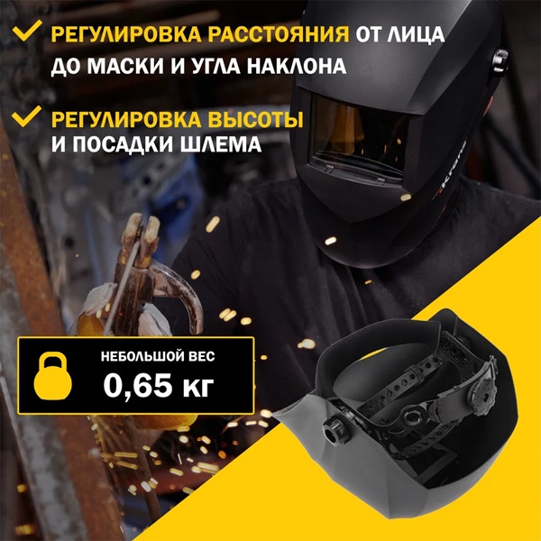 Эргономичный и регулируемый наголовник гарантирует удобство и надежную фиксацию маски, позволяя сварщику работать длительное время без дискомфорта. Маска совместима с различными видами сварки, включая MMA, MIG и MAG, что делает её универсальным выбором как для профессионалов, так и для любителей.