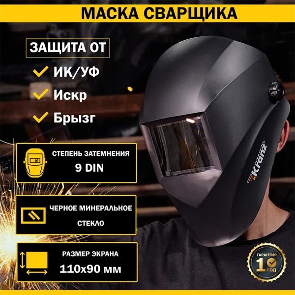 Сварочная маска KRANZ с черным минеральным стеклом DIN 9 обеспечивает надежную защиту головы и органов зрения сварщика от инфракрасного (ИК) и ультрафиолетового (УФ) излучений, искр и брызг расплавленного металла. Благодаря прочной конструкции и высококачественным материалам, маска эффективно справляется с защитой даже в сложных условиях эксплуатации, включая работы при отрицательных температурах.