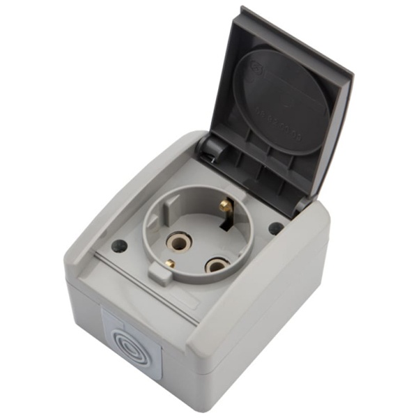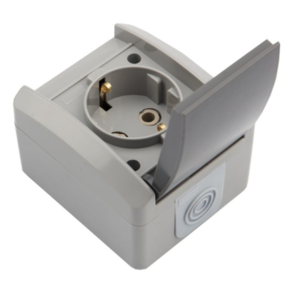 Герметичная электрическая однопостовая розетка немецкого стандарта серого цвета с керамическим механизмом для открытой проводки, Кранз Индастриал. KR-78-0612