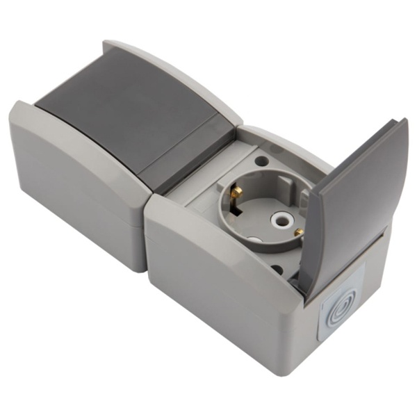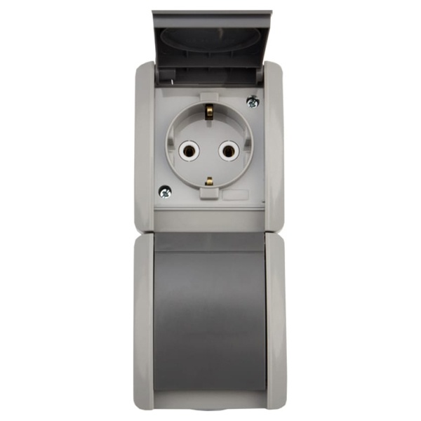 Герметичная электрическая двухпостовая розетка немецкого стандарта серого цвета с керамическим механизмом для вертикальной накладной установки, Кранз Индастриал. KR-78-0616