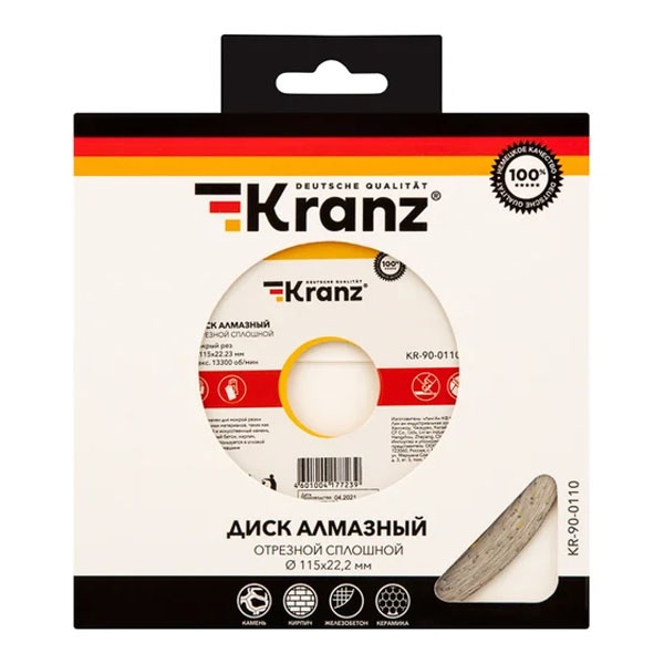Диск алмазный отрезной сплошной 115x22.2 мм, для мокрой резки по камню, бетону, керамике Kranz KR-90-0110