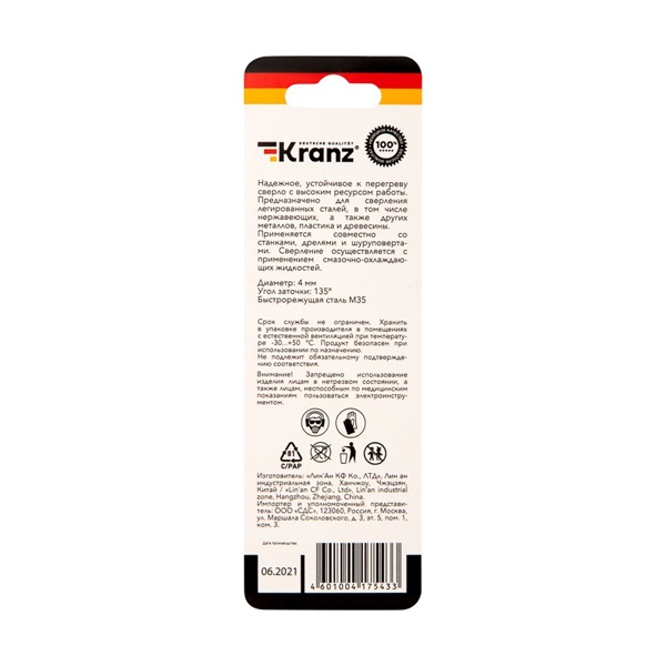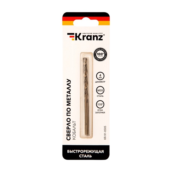 KR-91-0505 Сверло по металлу Kranz 4мм Кобальт (сталь HSS-Co 5% M35 P6M5K5) (1 шт. в блистере) DIN 338 фото 1