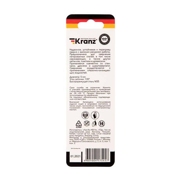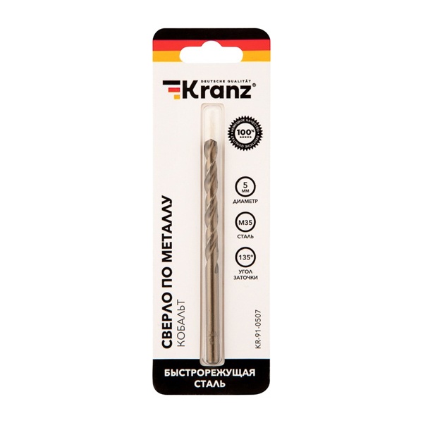 KR-91-0507 Сверло по металлу Kranz 5мм Кобальт (сталь HSS-Co 5% M35 P6M5K5) (1 шт. в блистере) DIN 338