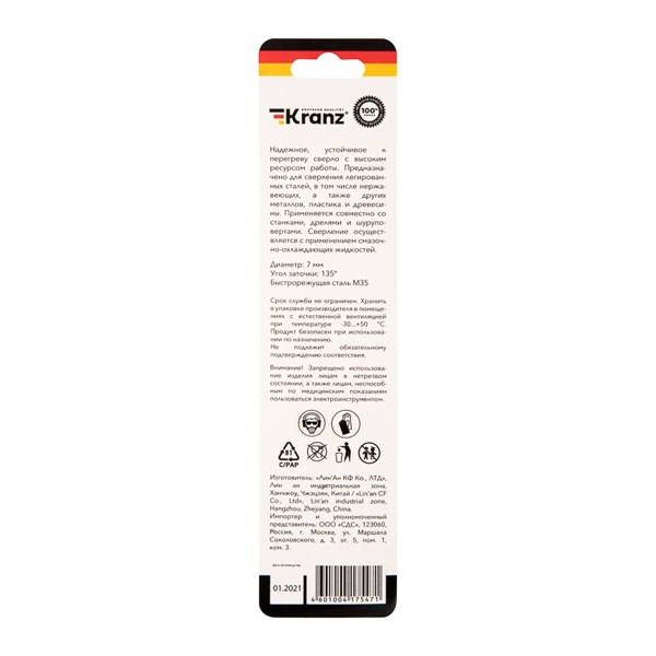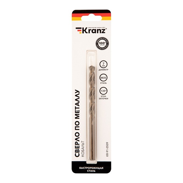 KR-91-0509 Сверло по металлу Kranz 7мм Кобальт (сталь HSS-Co 5% M35 P6M5K5) (1 шт. в блистере) DIN 338