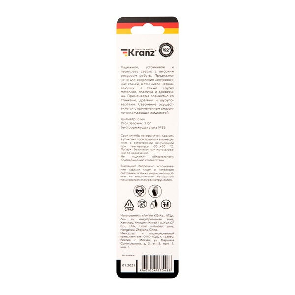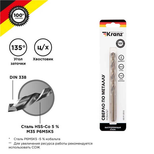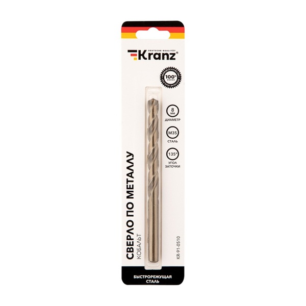 KR-91-0510 Сверло по металлу Kranz 8мм Кобальт (сталь HSS-Co 5% M35 P6M5K5) (1 шт. в блистере) DIN 338