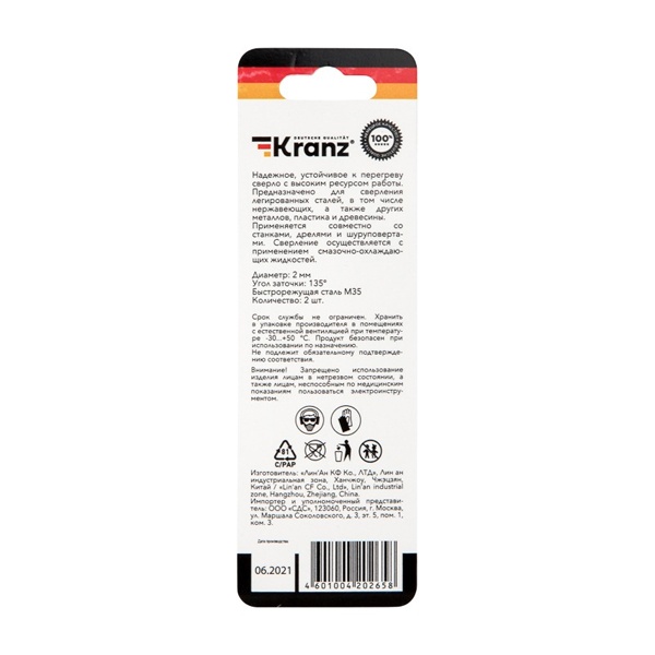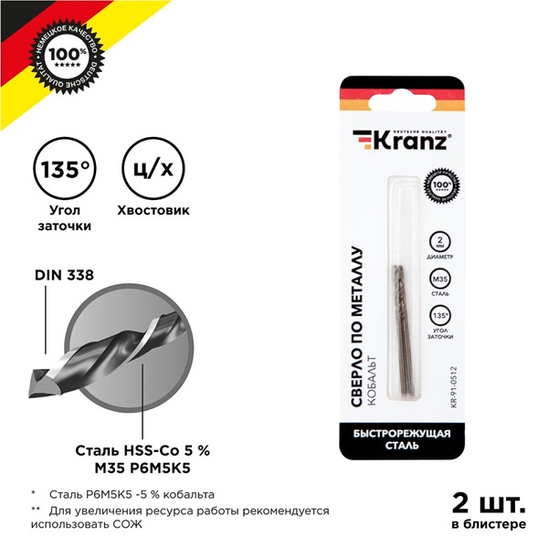 Сверло по металлу KRANZ соответствует стандартам профессиональной оснастки и используется во время различных ремонтных работ. Предназначено для сверления отверстий в нержавеющей и жаростойкой стали, легированной и нелегированной стали, сером чугуне, стальном литье, кислотостойкой стали, титане и титановых сплавах при помощи дрели с цилиндрическим креплением, которое используется в большинстве электроинструментов бытового и профессионального назначения. Изделие выполнено из качественной стали с добавлением 5% кобальта, что обеспечивает долгий ресурс работы и высокую производительность. Конструкция со стабилизирующей спиралью сохраняет точное положение оснастки во время сверления, что гарантирует ровные и аккуратные отверстия. Заточка режущей части под углом 135 градусов способствует эффективному входу в материал, что увеличивает цикл службы оснастки и уменьшает износ бура.