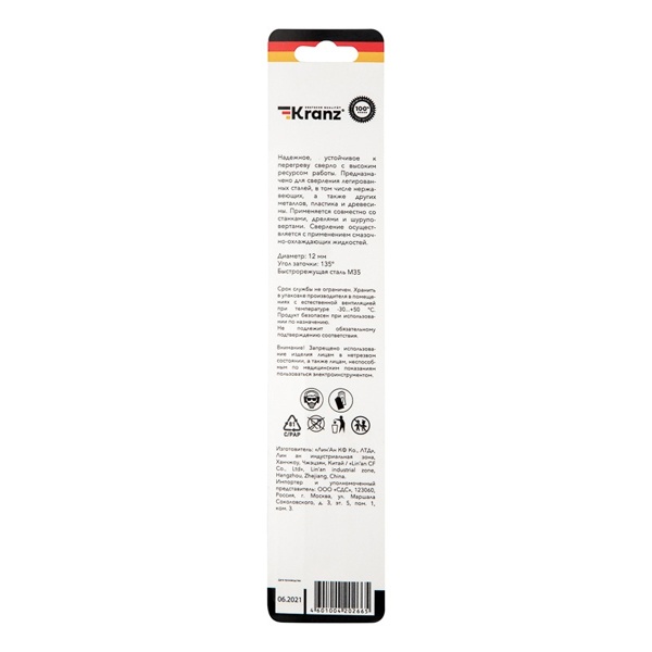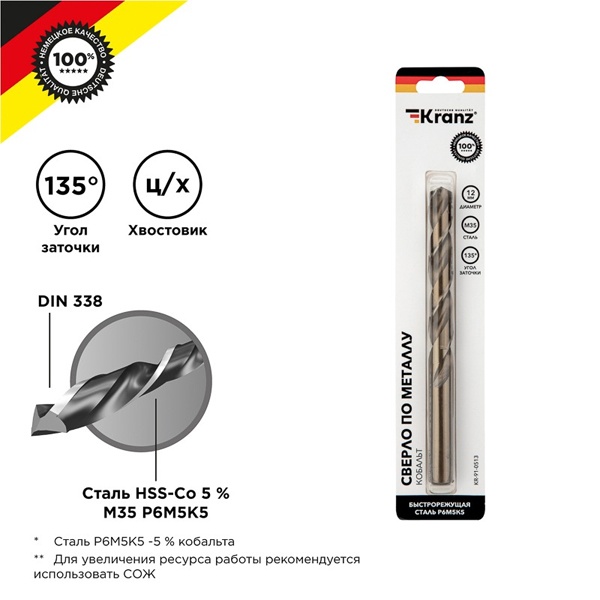 Сверло по металлу 12х151х101 мм «Кобальт» (сталь HSS-Co 5 % M35 P6M5K5) (1 шт. в блистере) DIN 338 KRANZ