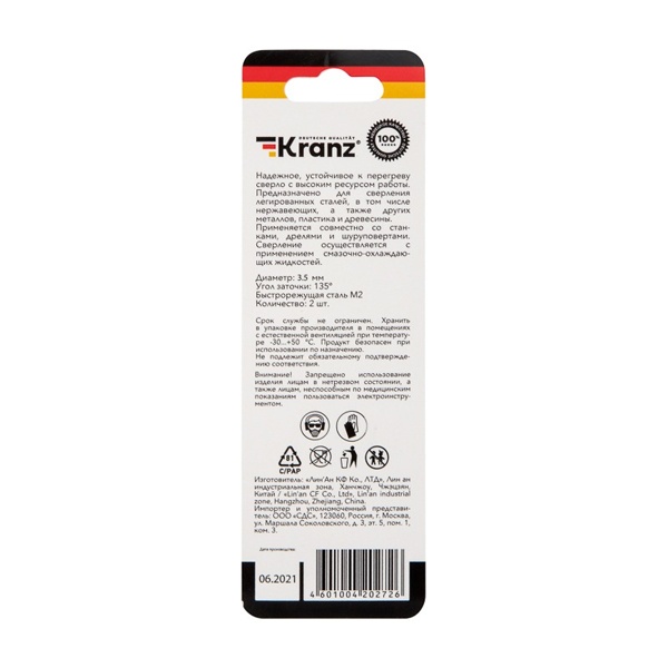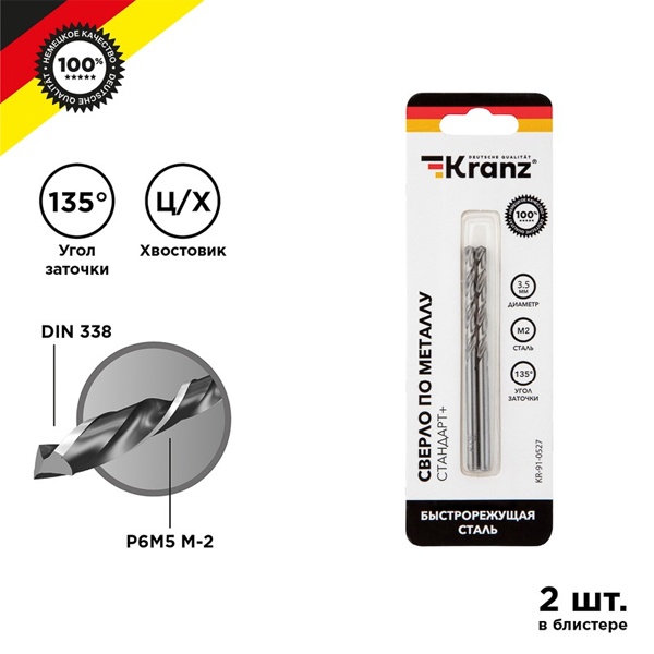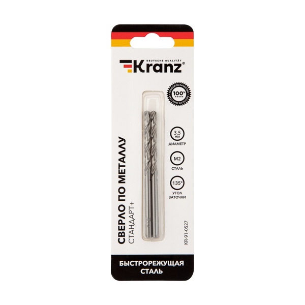 Сверла Кранц по металлу, диаметром 3,5 мм, общая длина 70 мм KR-91-0527
