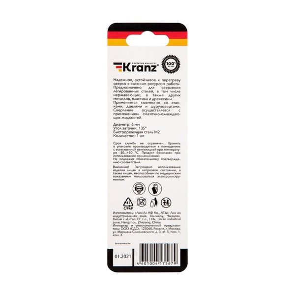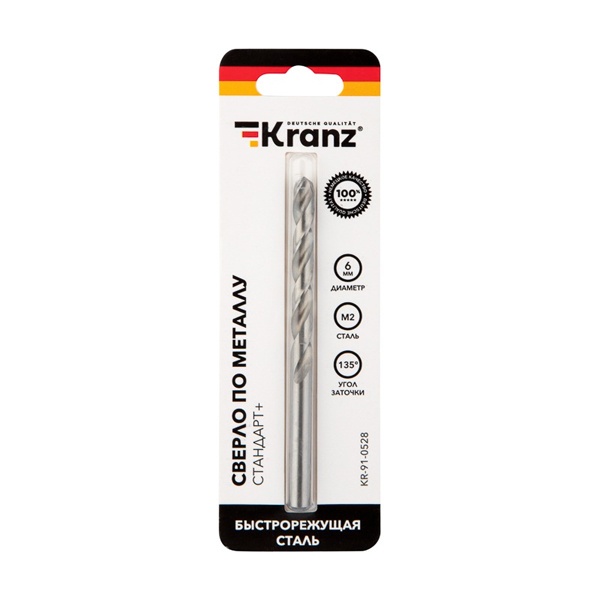 KR-91-0528 Сверло по металлу Kranz 6мм Стандарт+ (P6M5 M-2) (1 шт. в блистере) DIN 338