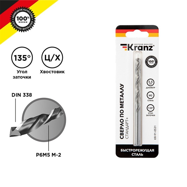 Сверло по металлу 5.5х93х57мм "Стандарт+" (P6M5 M-2) DIN 338 блист. Kranz KR-91-0531