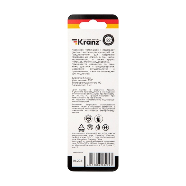 Сверло по металлу 5,5х93х57 мм «Стандарт+» (P6M5 M-2) (1 шт. в блистере) DIN 338 Kranz
