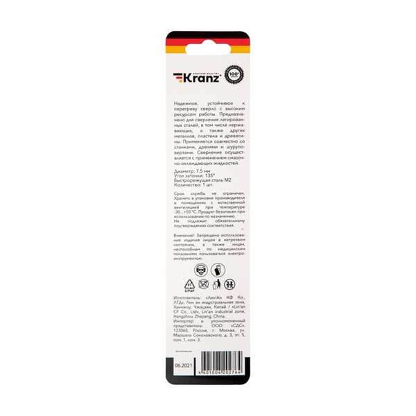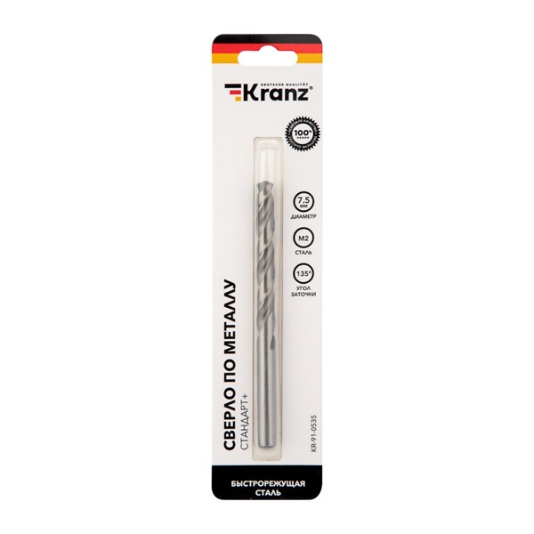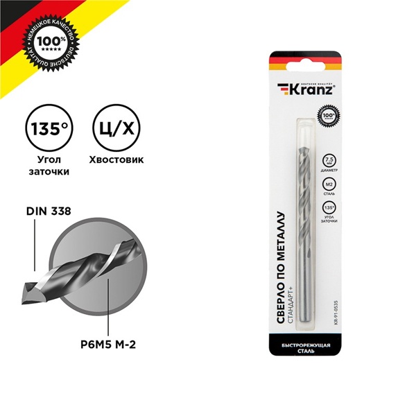 Сверло по металлу 7,5х109х69 мм «Стандарт+» (P6M5 M-2) (1 шт. в блистере) DIN 338 Kranz