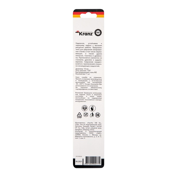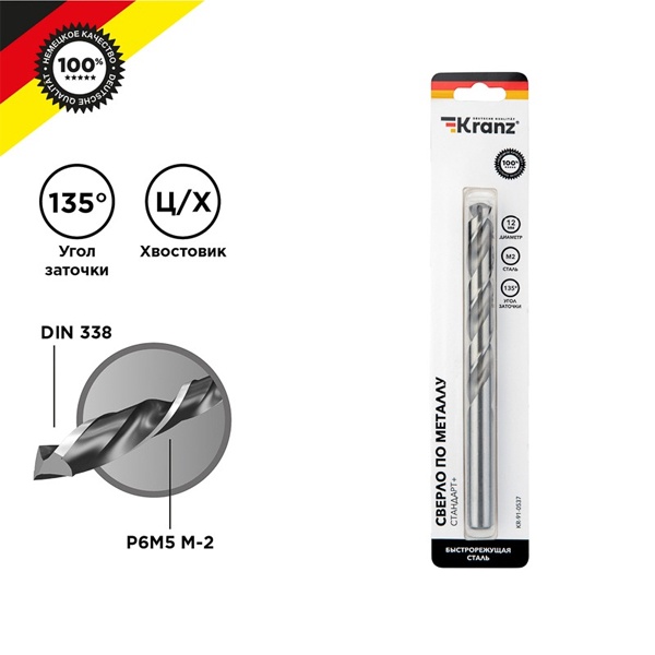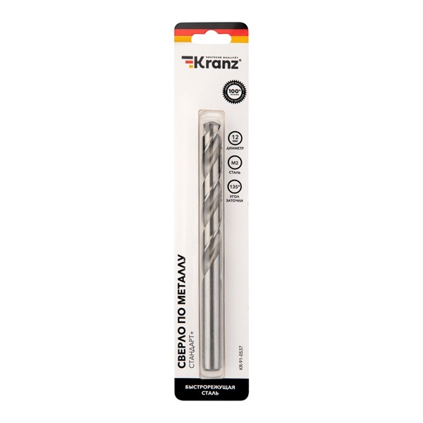 Сверло по металлу 12х151х101 мм «Стандарт+» (P6M5 M-2) (1 шт. в блистере) DIN 338 Kranz