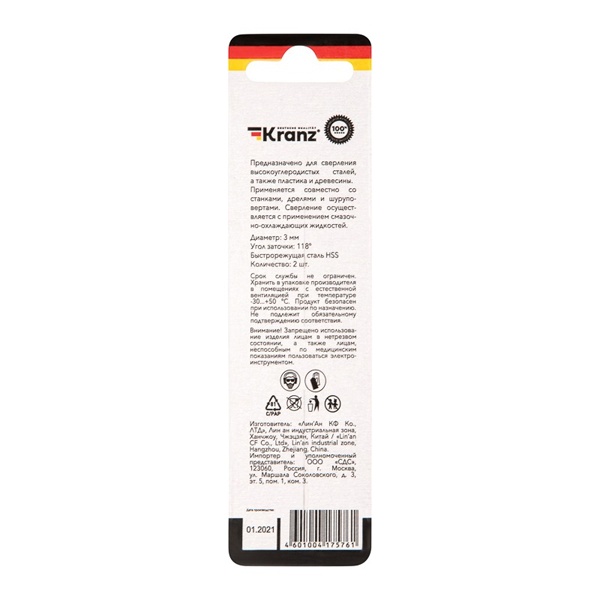 • Сверло по металлу Kranz 3,0 мм HSS (2 шт. в упаковке) DIN 338