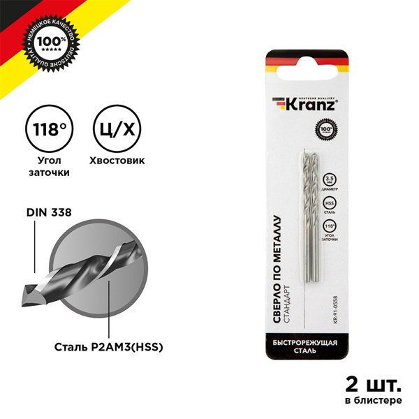 Сверло Кранц по металлу, диаметром 3,5 мм, общая длина 70 мм KR-91-0558