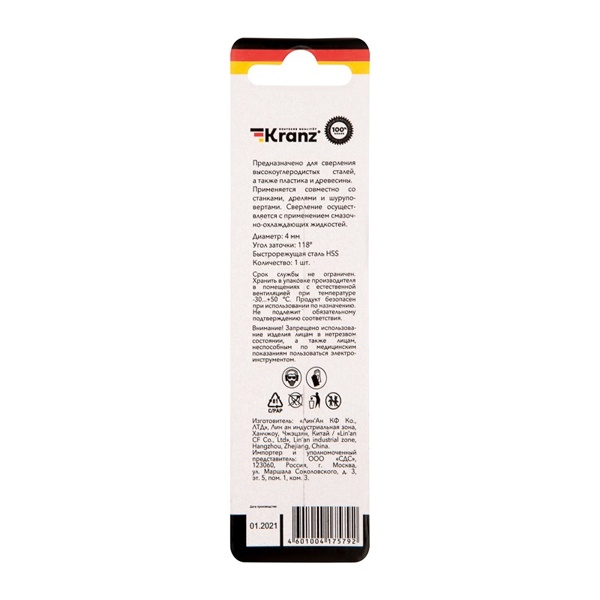 Сверло KRANZ соответствует стандартам профессиональной оснастки. Предназначено для сверления отверстий в мягких и средних по твердости металлах, пластике и различных породах дерева при помощи дрели или станка с цилиндрическим креплением, которое используется в большинстве электроинструментов бытового и профессионального назначения. Изделие выполнено из качественной инструментальной стали, что обеспечивает долгий ресурс работы и высокую производительность. Конструкция со стабилизирующей спиралью сохраняет точное положение оснастки во время сверления, что гарантирует ровные и аккуратные отверстия без трещин и сколов. Заточка режущей части под углом 118 градусов способствует эффективному входу в материал, что увеличивает цикл службы оснастки и уменьшает износ бура. Диаметр хвостовика соответствует диаметру сверления.