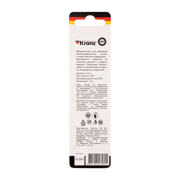 Сверло по металлу 5,0х86х52 мм HSS (1 шт. в упаковке) DIN 338 Kranz